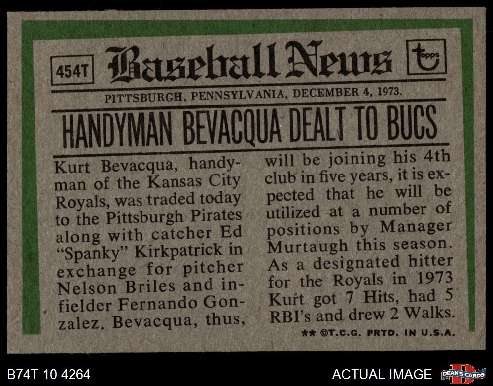 1974 Topps #454 T - Kurt Bevacqua Traded 7 - NM