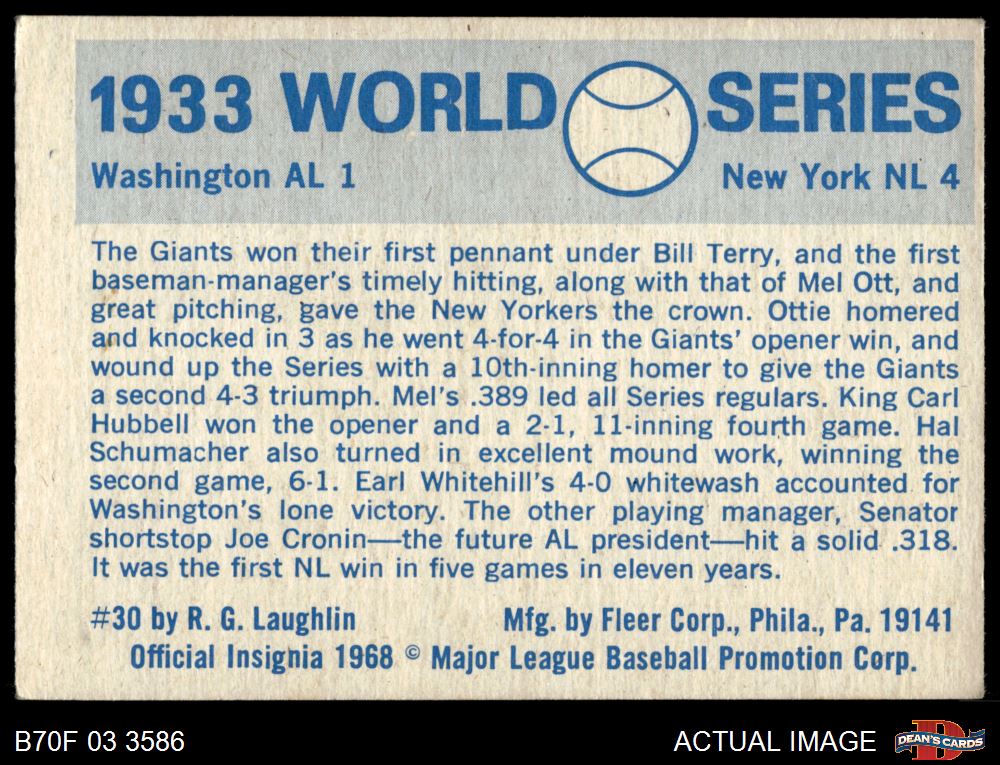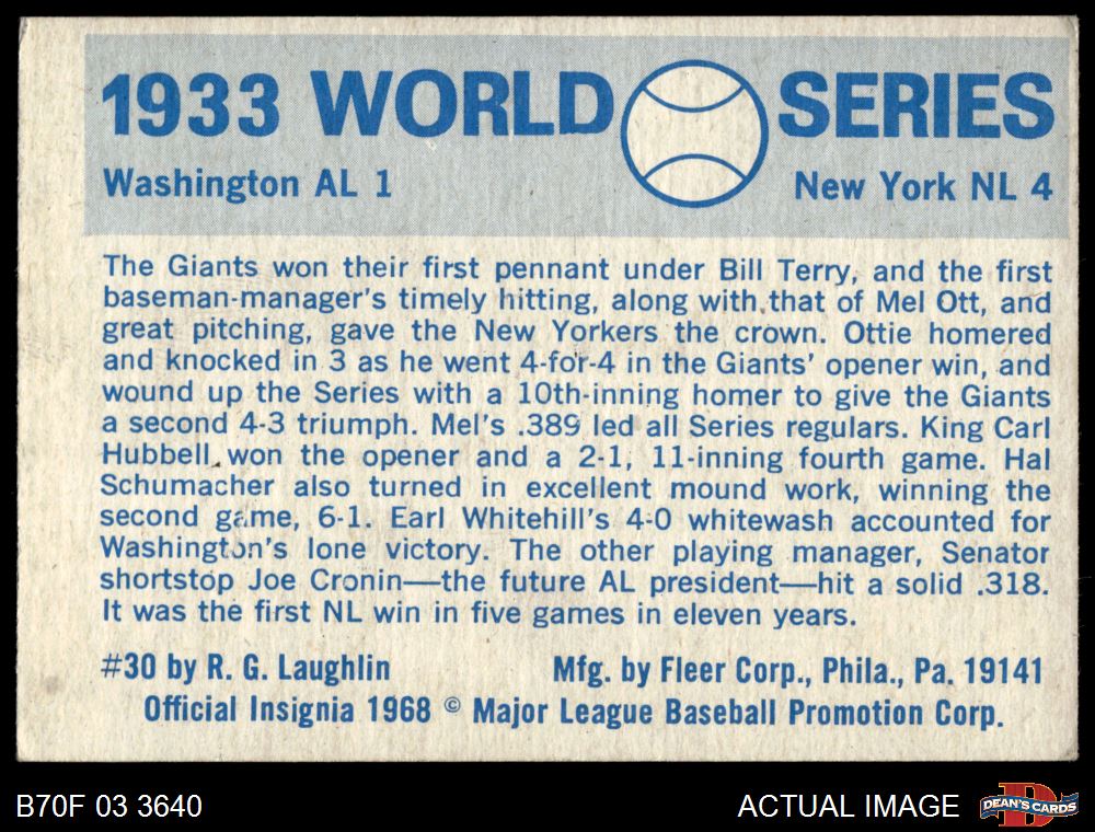 1970 Fleer World Series #30 - Mel Ott 1933 Giants vs. Senators 3 - VG