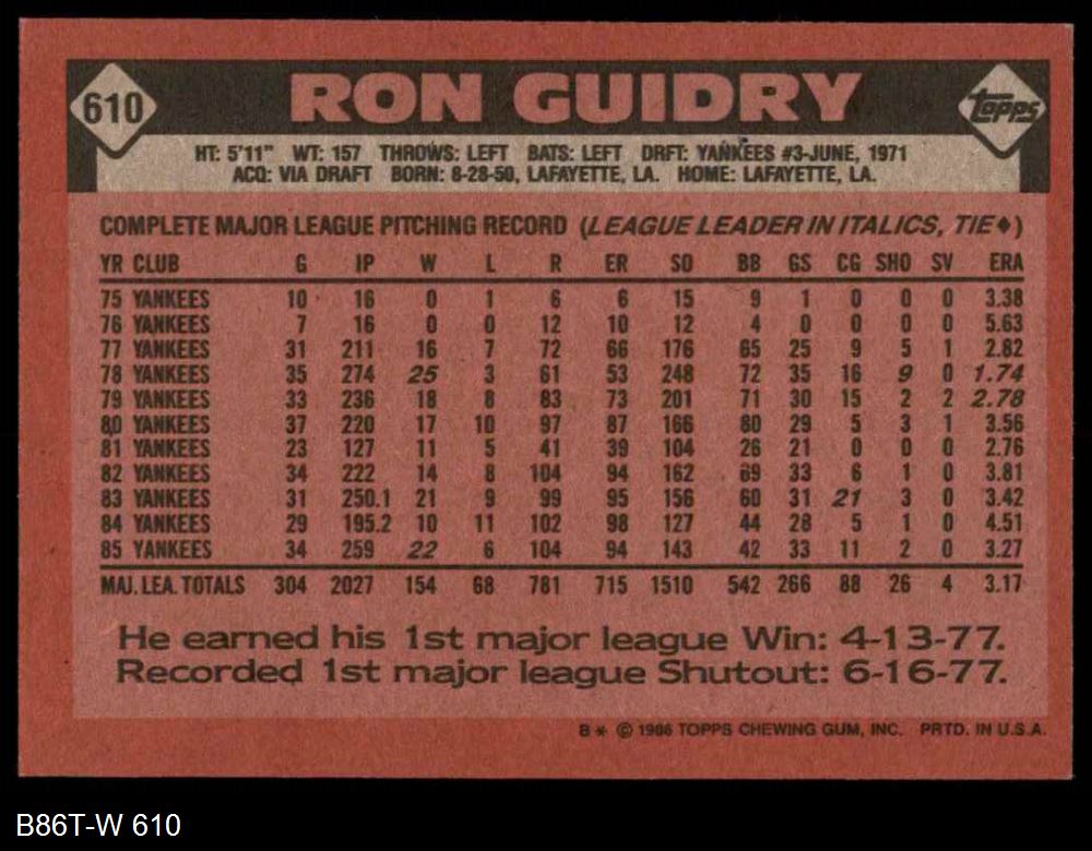 1986 Topps #610 Ron Guidry