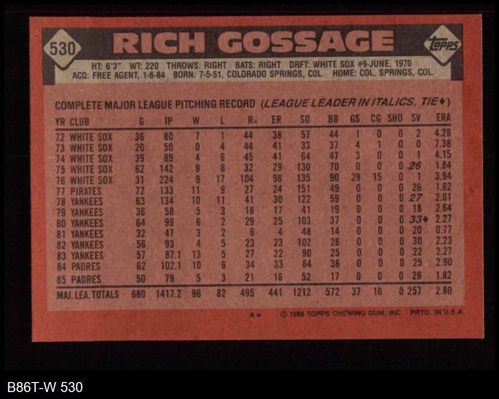 1986 Topps #530 Goose Gossage 8 - NM/MT