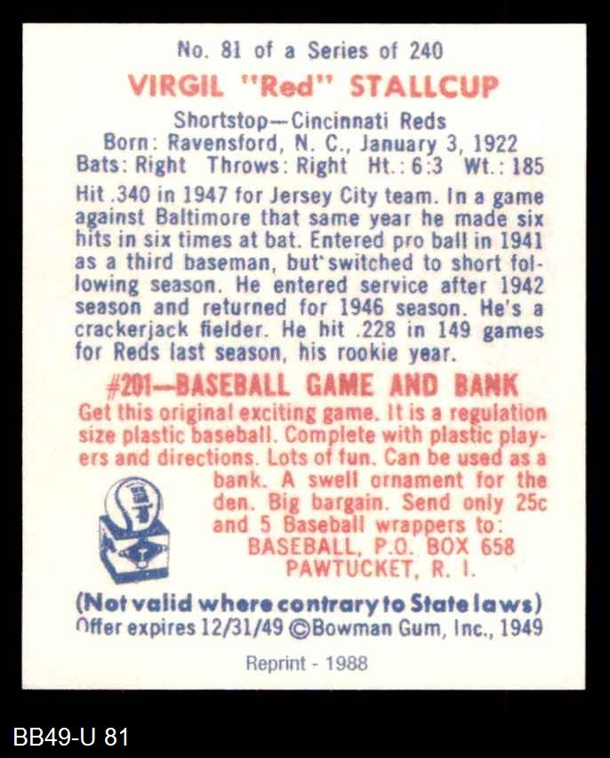 1949 Bowman REPRINT #81 Virgil Stallcup 8 - NM/MT