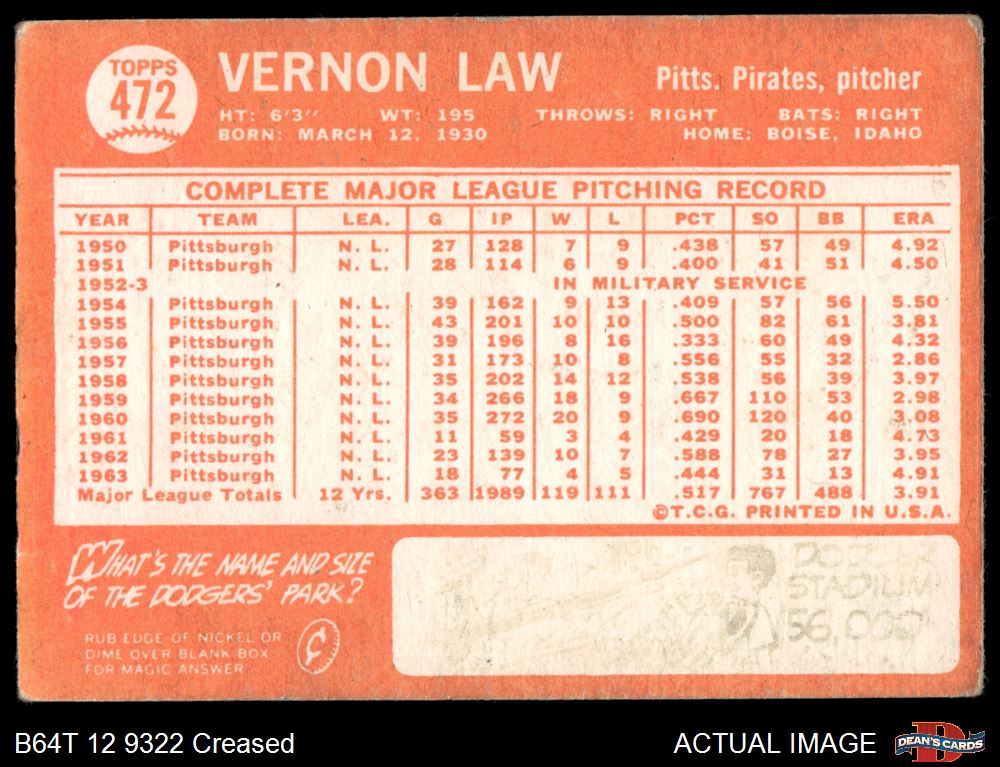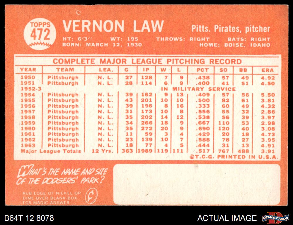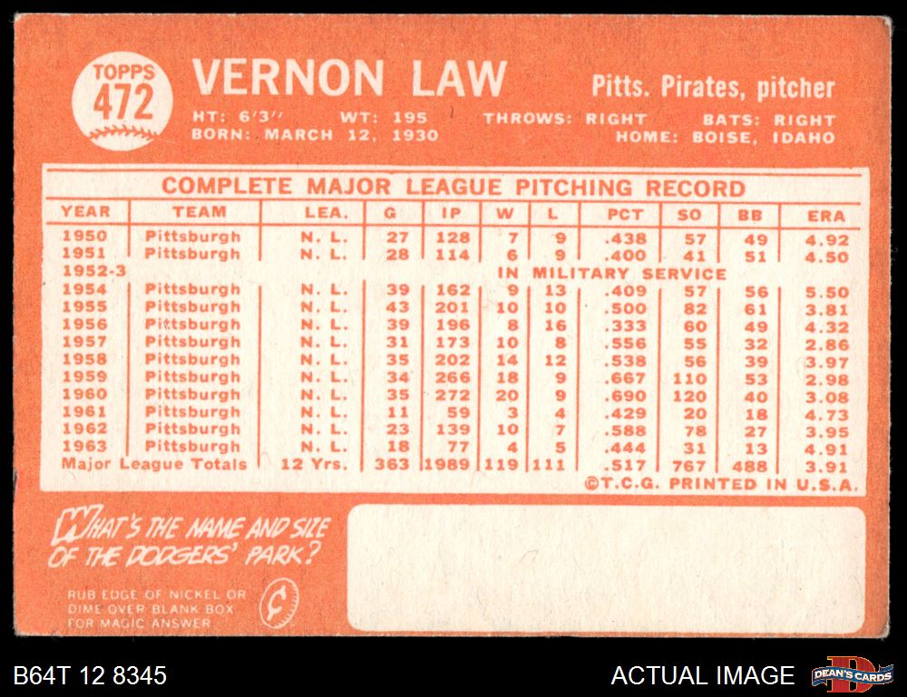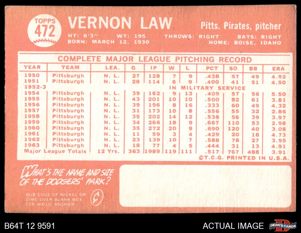 1964 Topps #472 Vern Law