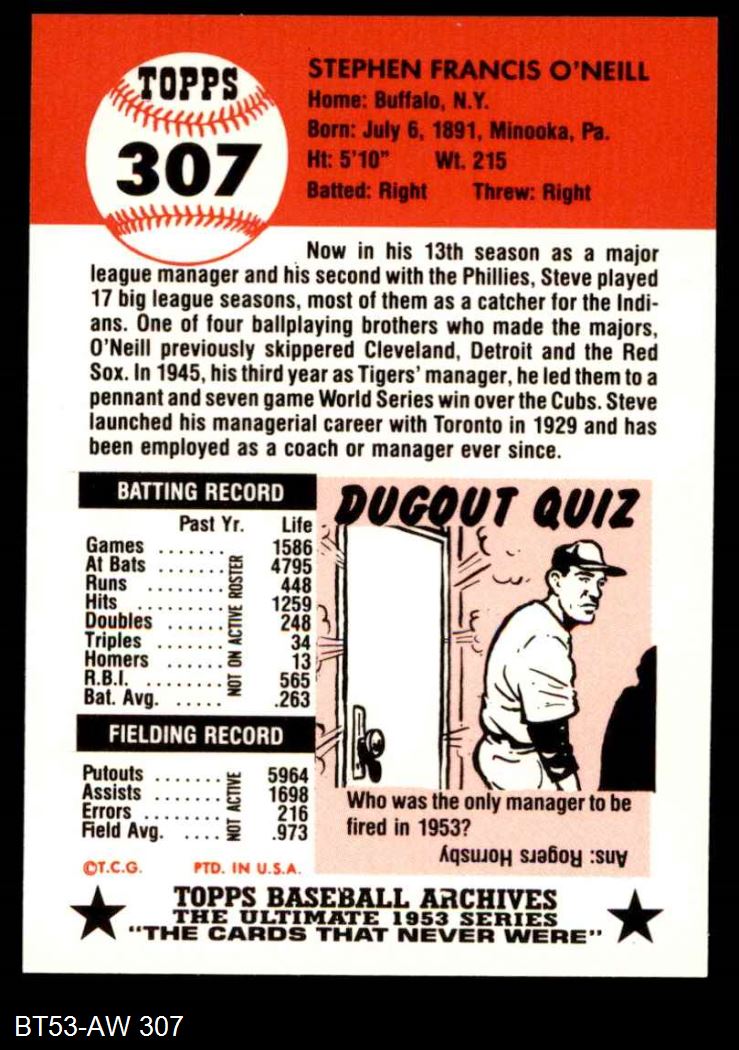 1953 Topps Archives #307 Steve O'Neill 8 - NM/MT