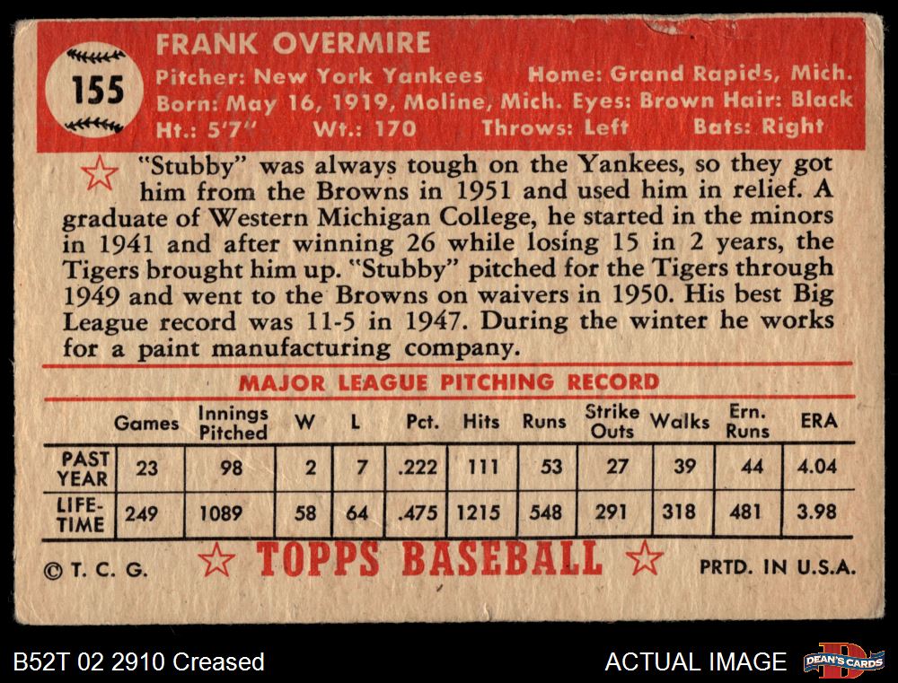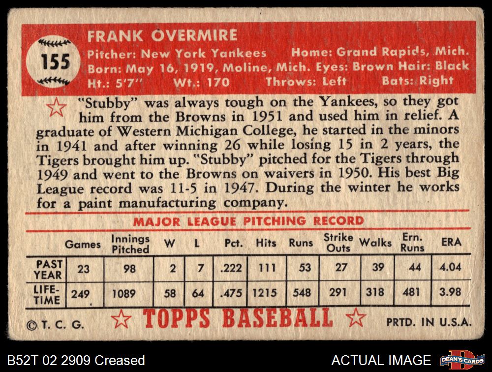 1952 Topps #155 CRM Frank Overmire 2 - GOOD