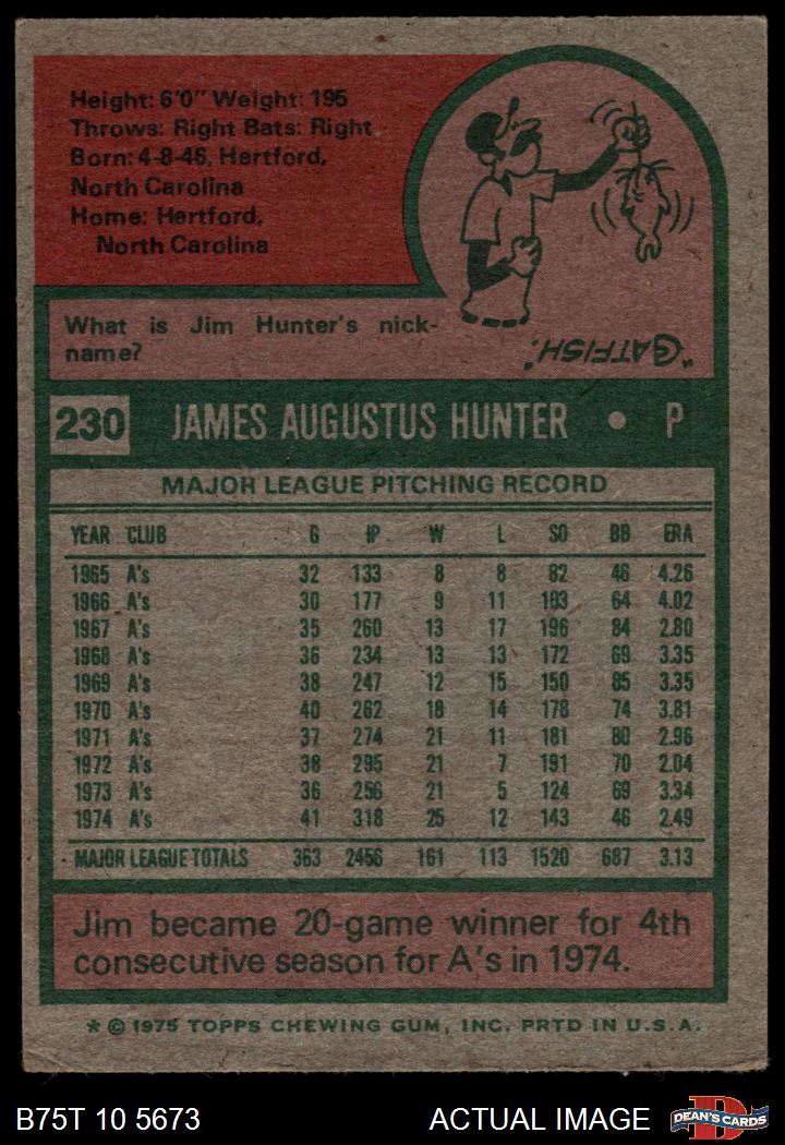 1975 Topps #230 Catfish Hunter 4 - VG/EX