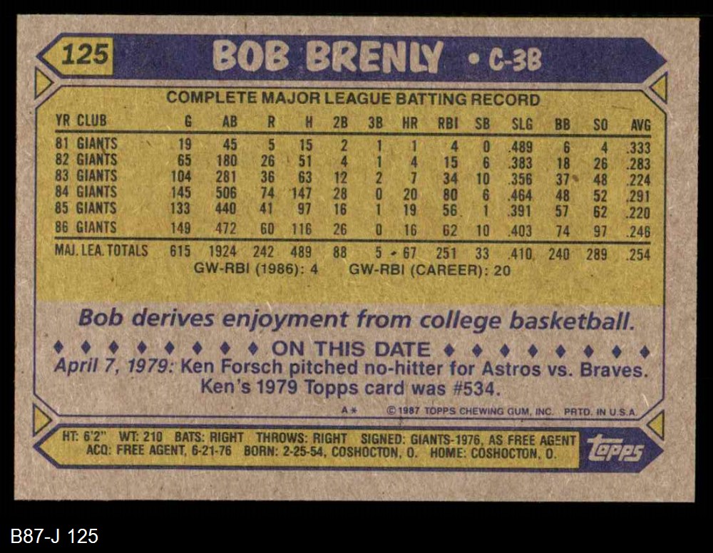 1987 Topps #125 Bob Brenly 8 - NM/MT