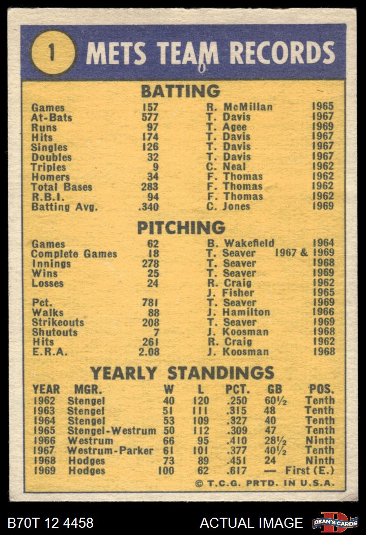 1970 Topps #1 World Champions - Mets Team 4 - VG/EX