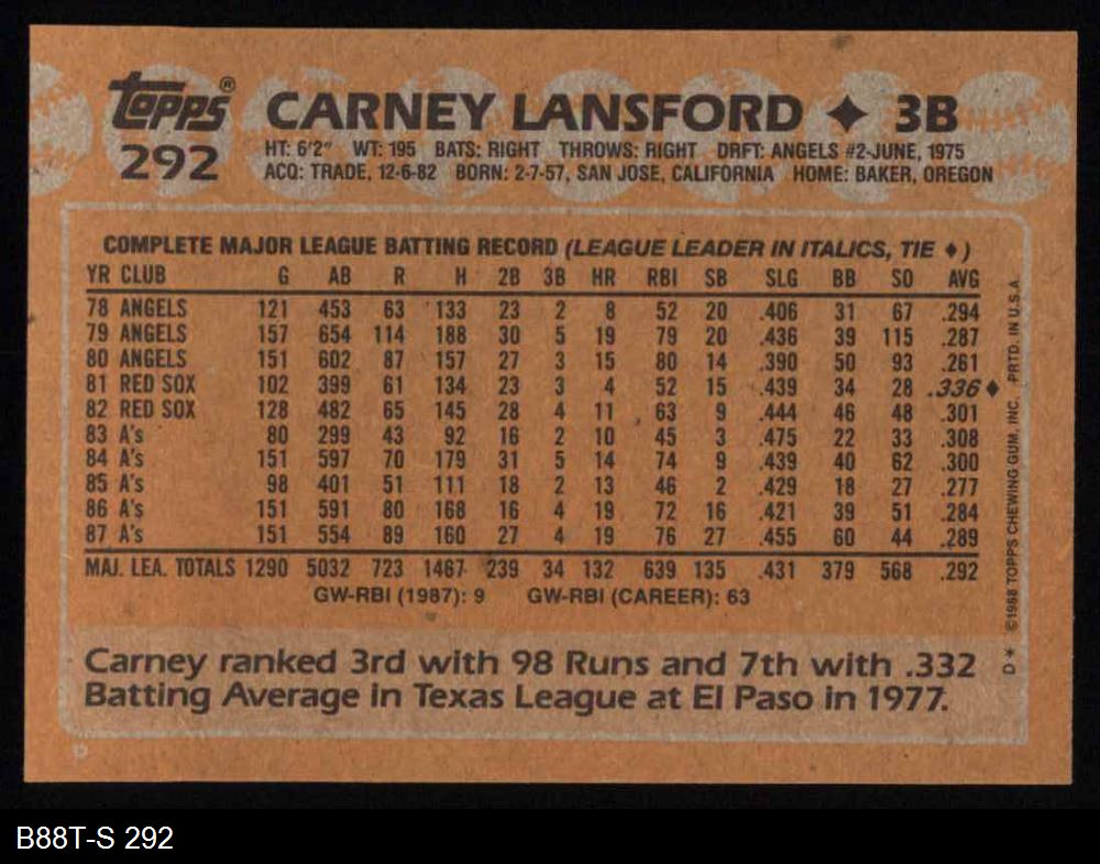 1988 Topps #292 Carney Lansford 8 - NM/MT