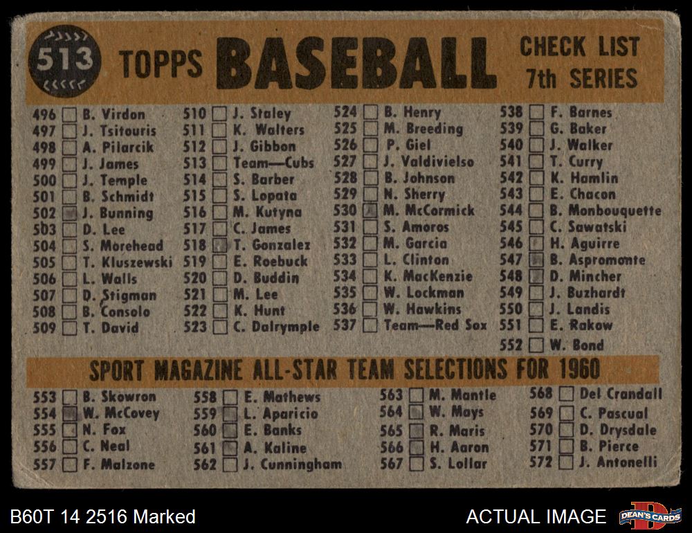 1960 Topps #513 Cubs Team Checklist 1 - POOR