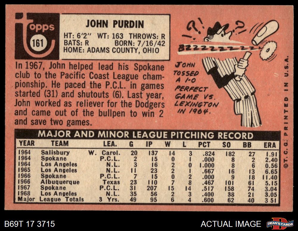 1969 Topps #161 John Purdin 6.5 - EX/MT+