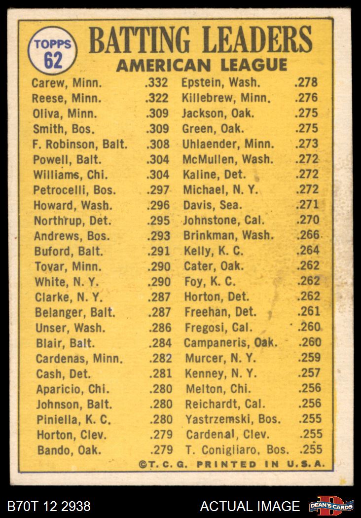 1970 Topps #62 - Rod Carew / Tony Oliva / Reggie Smith AL Batting Leaders 5 - EX