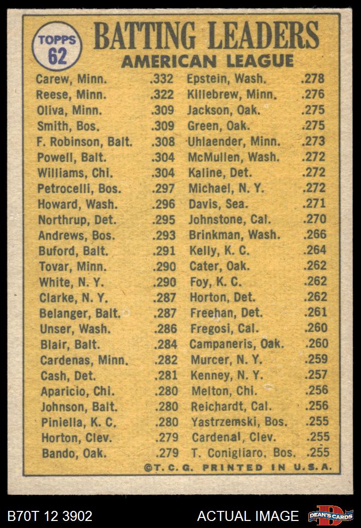 1970 Topps #62 - Rod Carew / Tony Oliva / Reggie Smith AL Batting Leaders 7 - NM