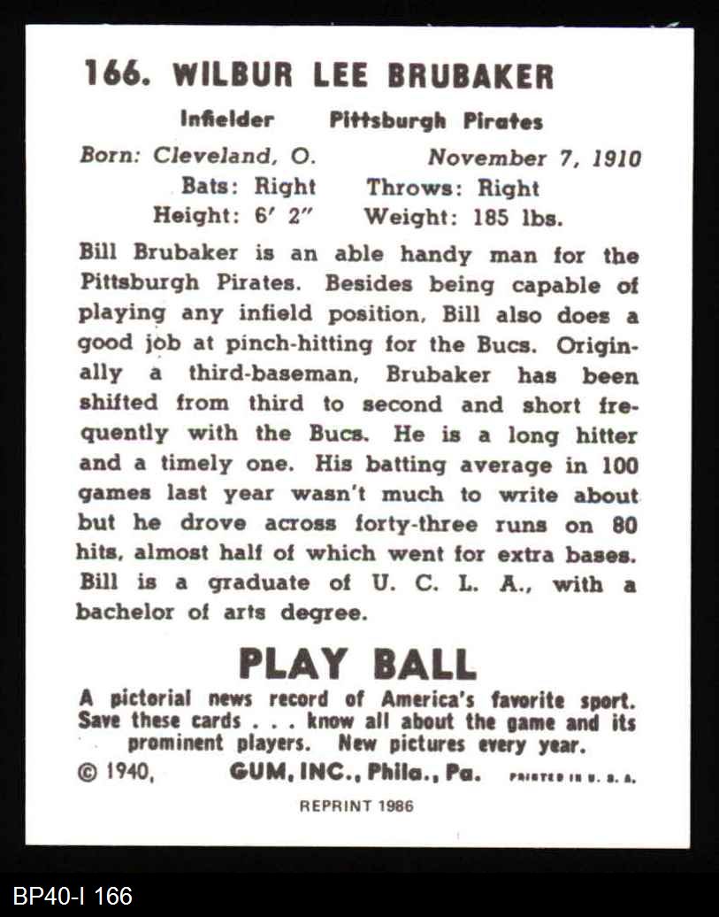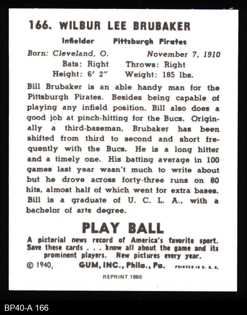 1940 Play Ball Reprint #166 Bill Brubaker