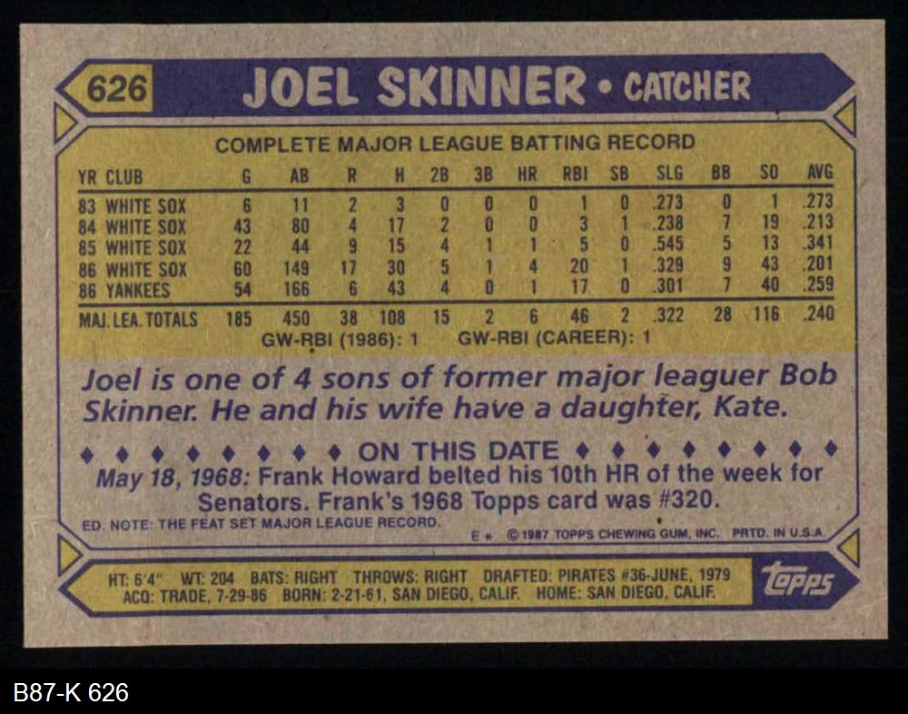 1987 Topps #626 Joel Skinner 8 - NM/MT
