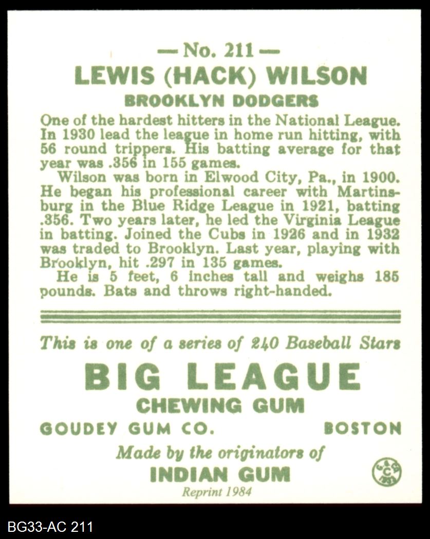1933 Goudey Reprint #211 Hack Wilson