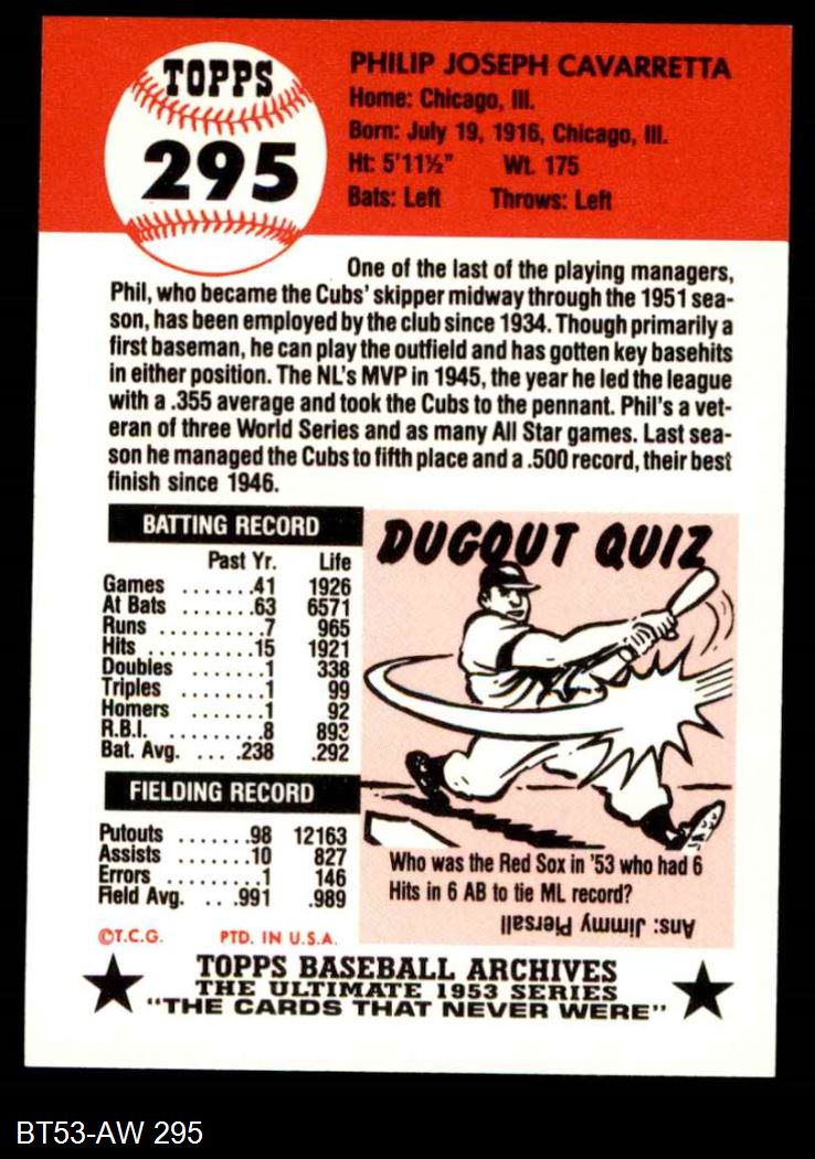 1953 Topps Archives #295 Phil Cavarretta