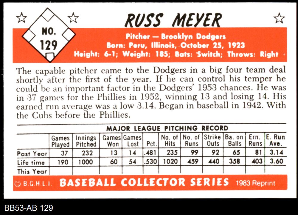 1953 Bowman REPRINT #129 Russ Meyer