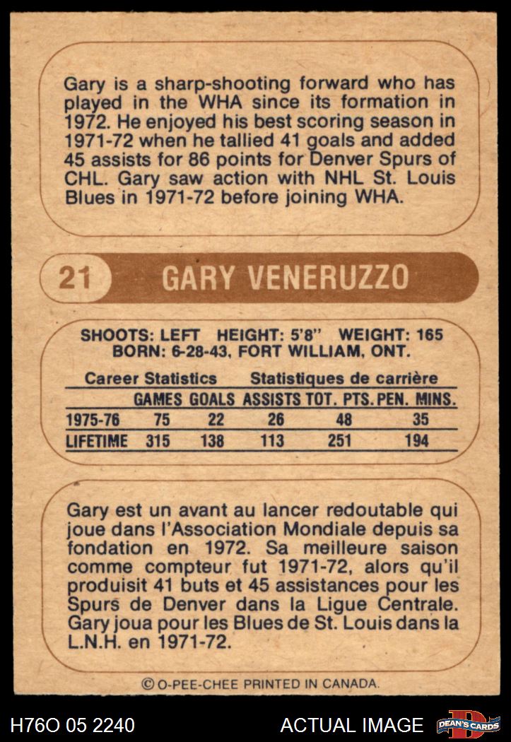 1976 O-Pee-Chee WHA #21 Gary Veneruzzo