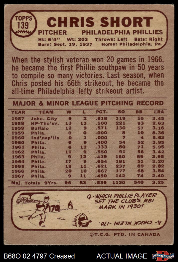 1968 O-Pee-Chee #139 Chris Short Front Thumbnail