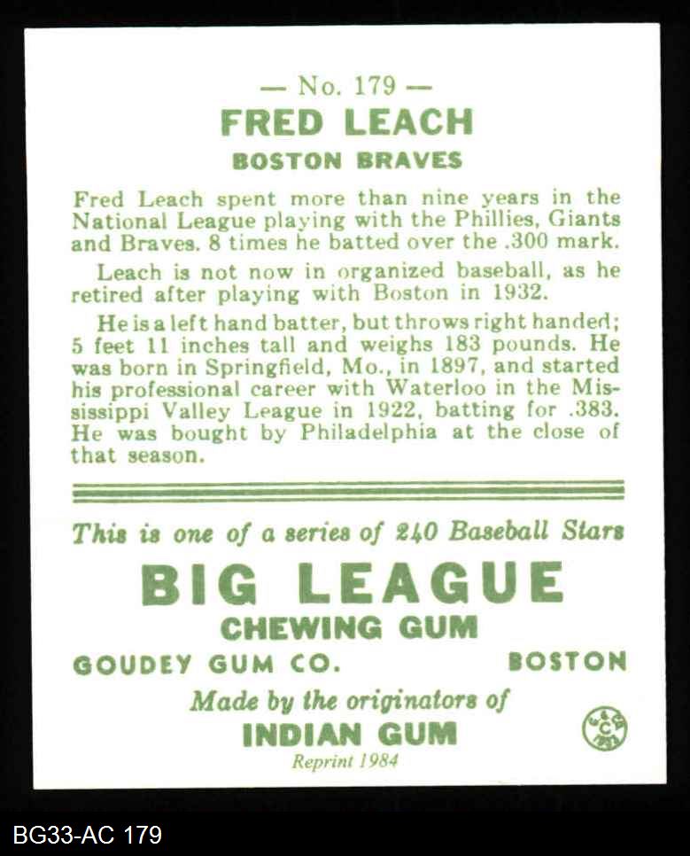 1933 Goudey Reprint #179 Fred Leach 8 - NM/MT