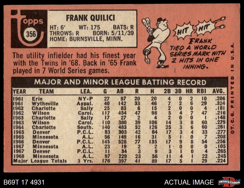 1969 Topps #356 Frank Quilici 2 - GOOD