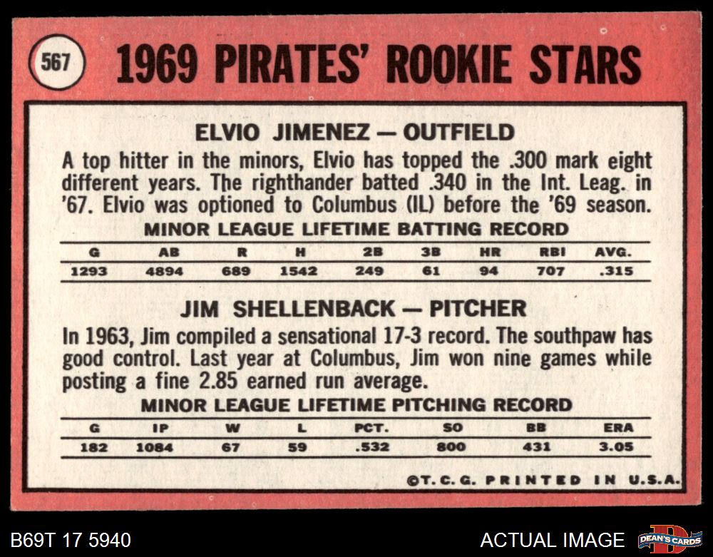 1969 Topps #567 OUT - Elvio Jimenez / Jim Shellenback Pirates Rookies 4 - VG/EX