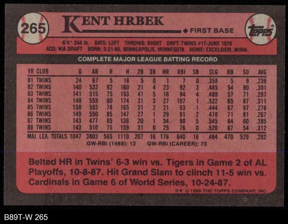 1989 Topps #265 Kent Hrbek 8 - NM/MT