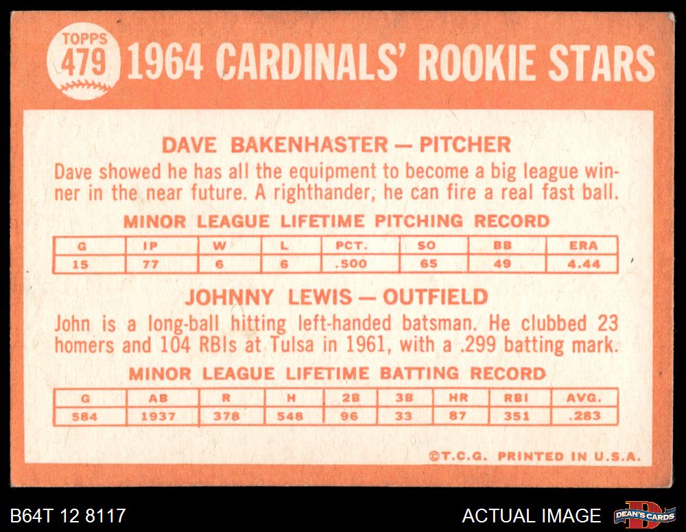 1964 Topps #479 - Dave Bakenhaster / Johnny Lewis Cardinals Rookies 4.5 - VG/EX+
