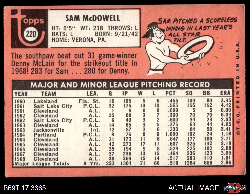 1969 Topps #220 Sam McDowell 2 - GOOD