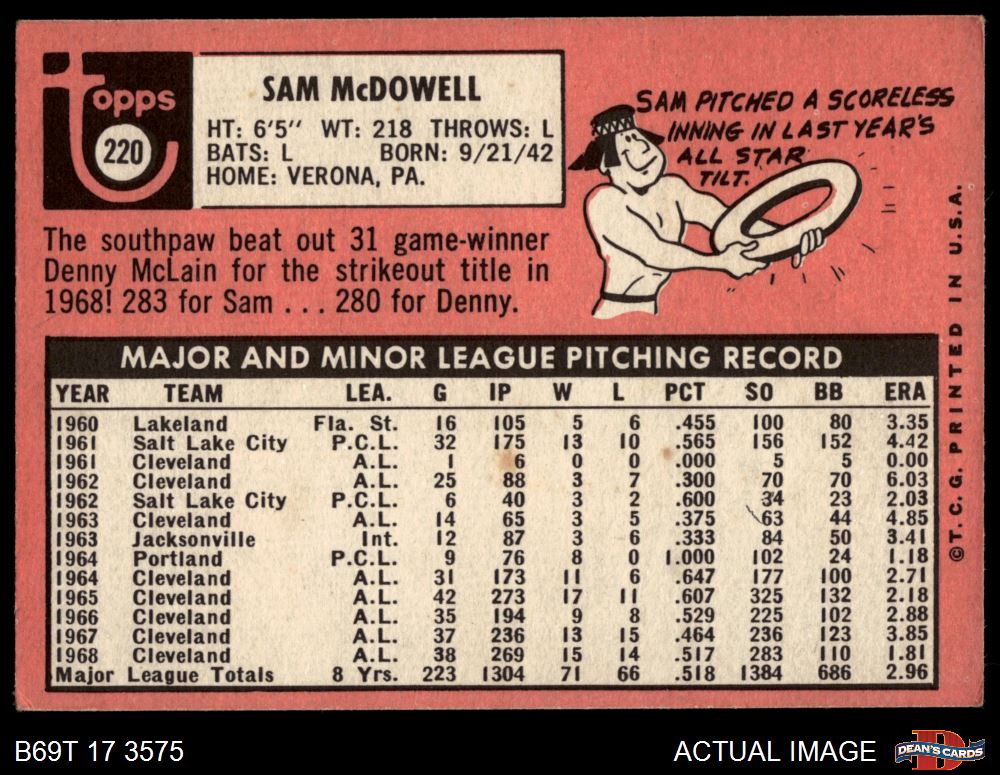1969 Topps #220 Sam McDowell 3 - VG