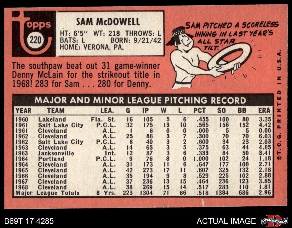1969 Topps #220 Sam McDowell 6 - EX/MT