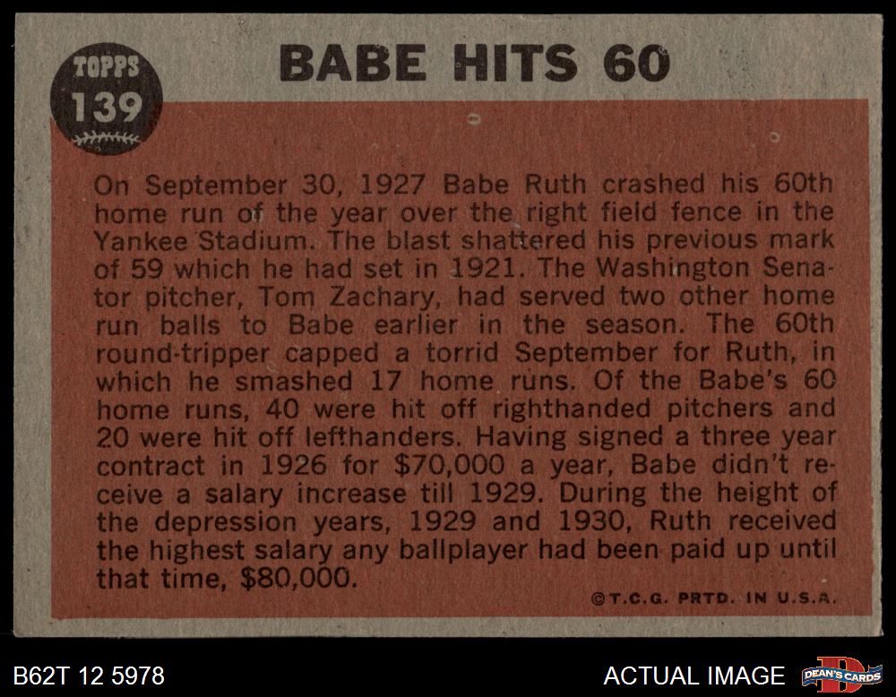 1962 Topps #139 NRM - Babe Ruth Babe Hits 60 3 - VG