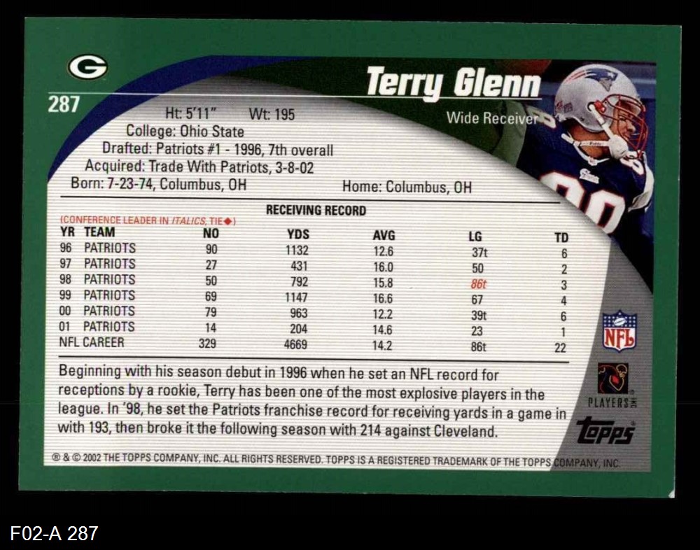 2002 Topps #287 Terry Glenn 8 - NM/MT