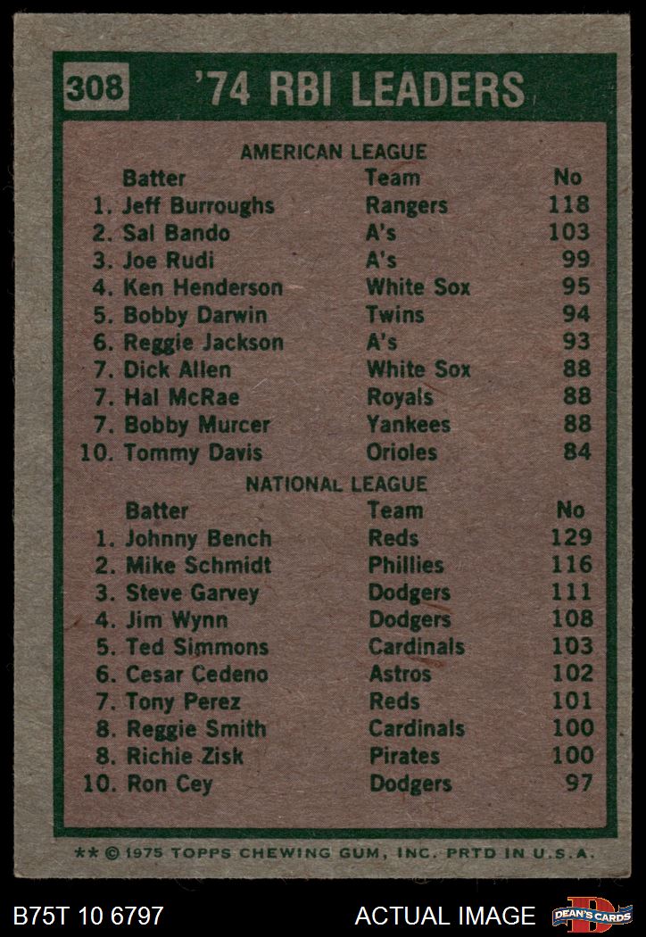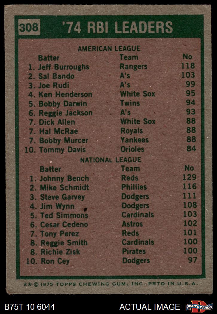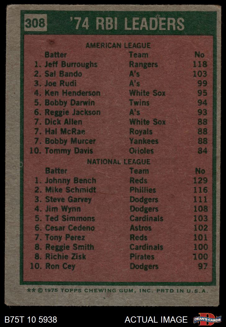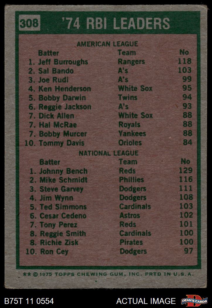 1975 Topps #308 - Johnny Bench / Jeff Burroughs RBI Leaders 3 - VG