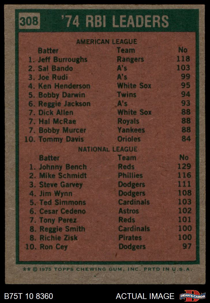 1975 Topps #308 - Johnny Bench / Jeff Burroughs RBI Leaders 6 - EX/MT