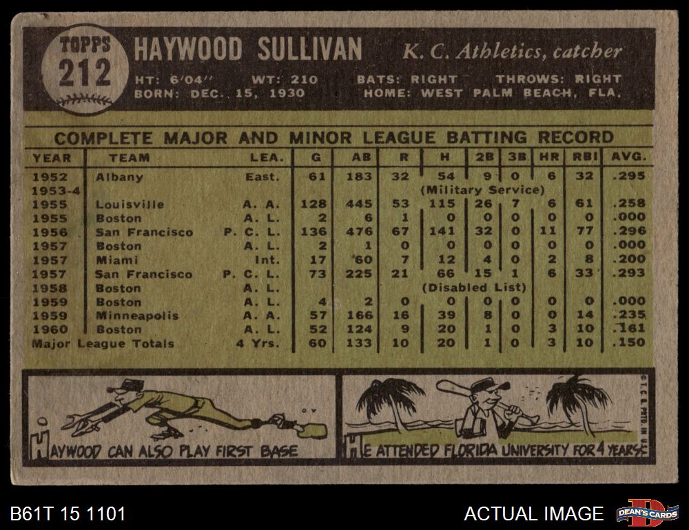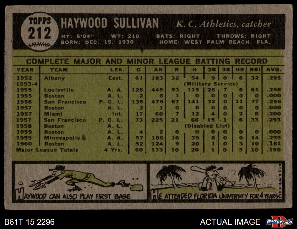 1961 Topps #212 Haywood Sullivan 2 - GOOD