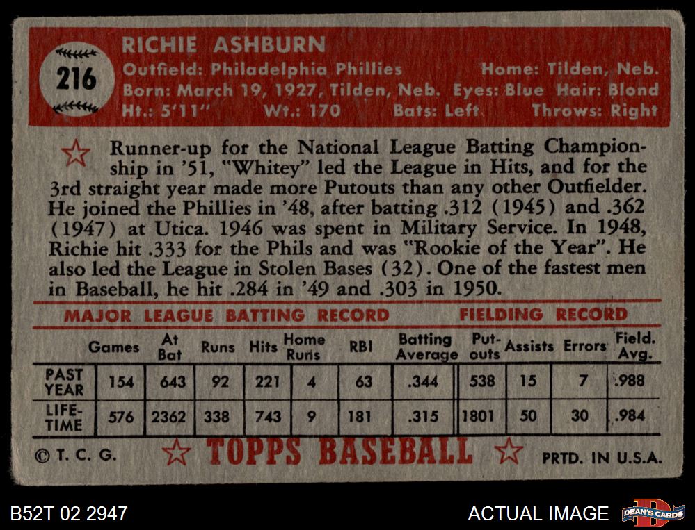 1952 Topps #216 Richie Ashburn 1 - POOR