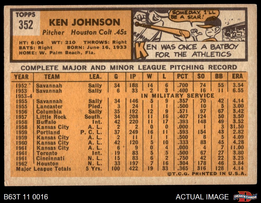 1963 Topps #352 Ken Johnson 3 - VG
