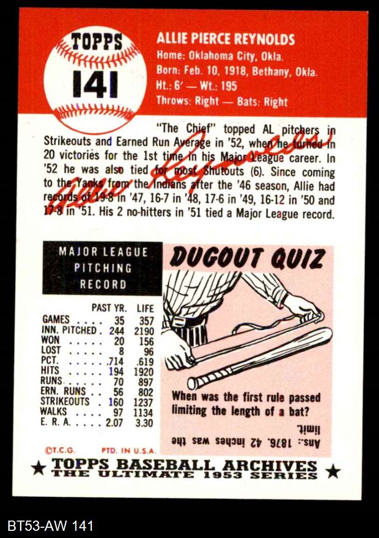 1953 Topps Archives #141 Allie Reynolds 8 - NM/MT