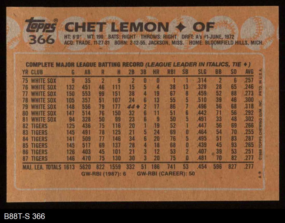 1988 Topps #366 Chet Lemon 8 - NM/MT