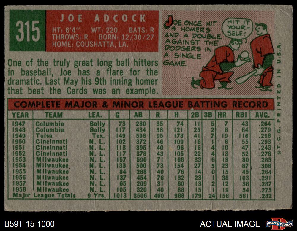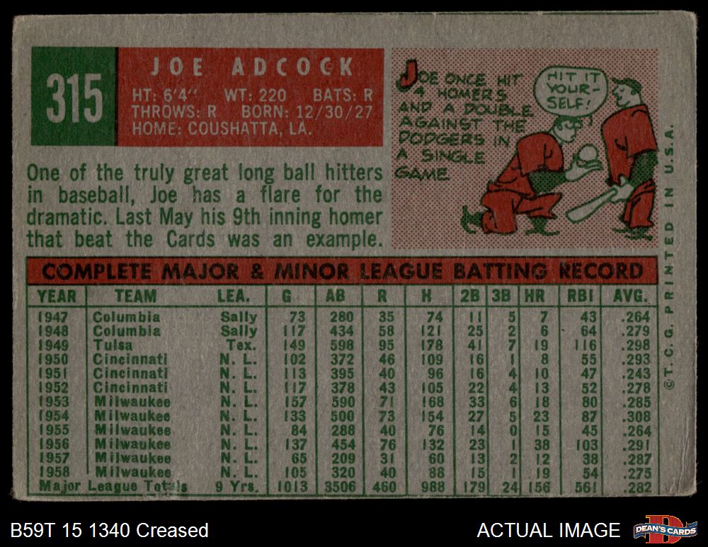 1959 Topps #315 Joe Adcock 2 - GOOD