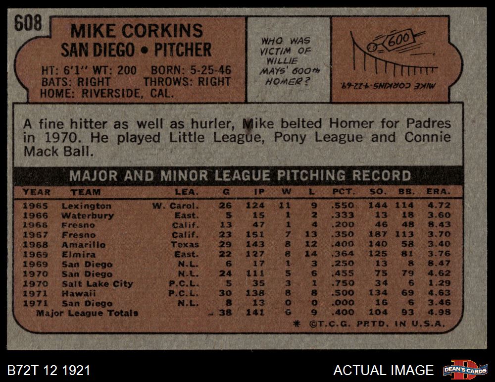 1972 Topps #608 Mike Corkins 5 - EX