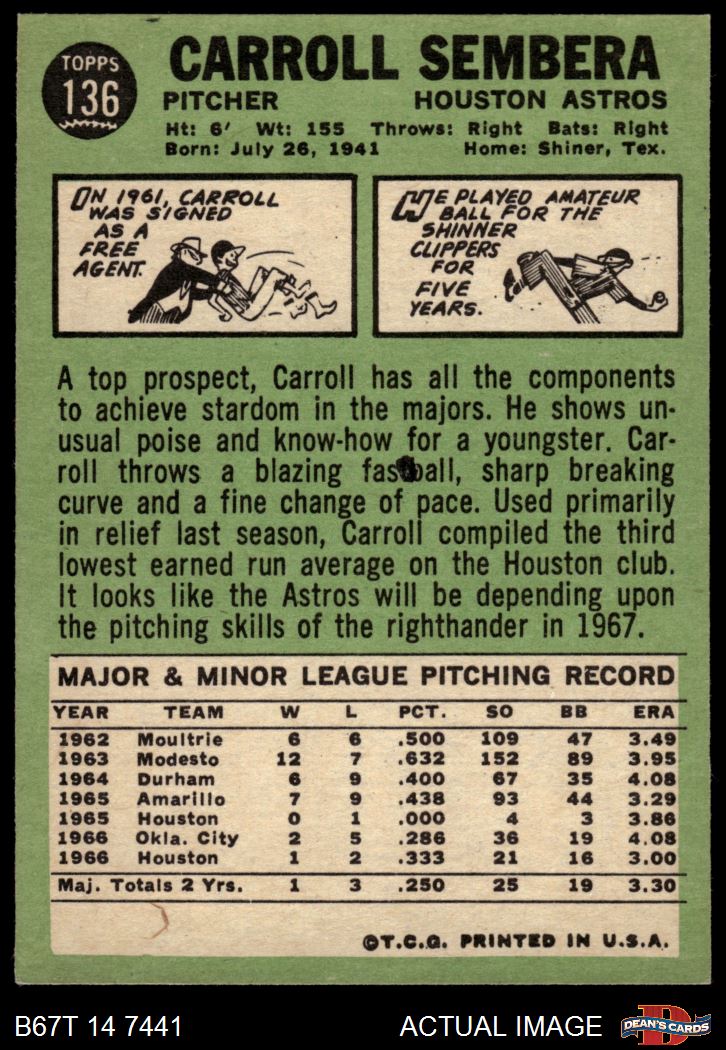 1967 Topps #136 Carroll Sembera 6.5 - EX/MT+