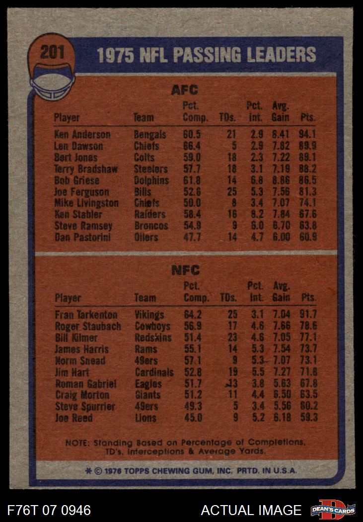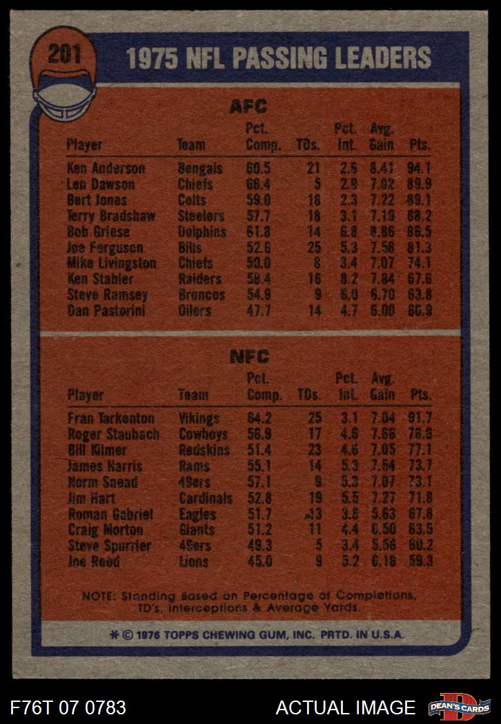 1976 Topps #201 - Fran Tarkenton / Ken Anderson Passing Leaders 5 - EX