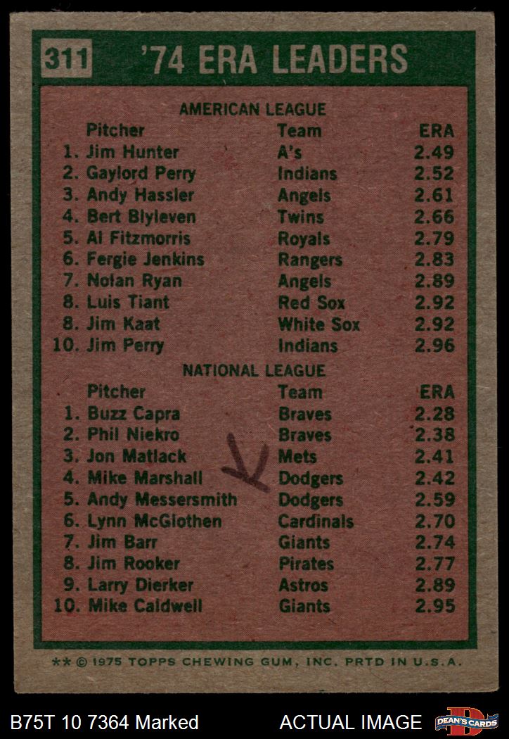 1975 1975 #311 - Catfish Hunter / Buzz Capra ERA Leaders 1.5 - FAIR