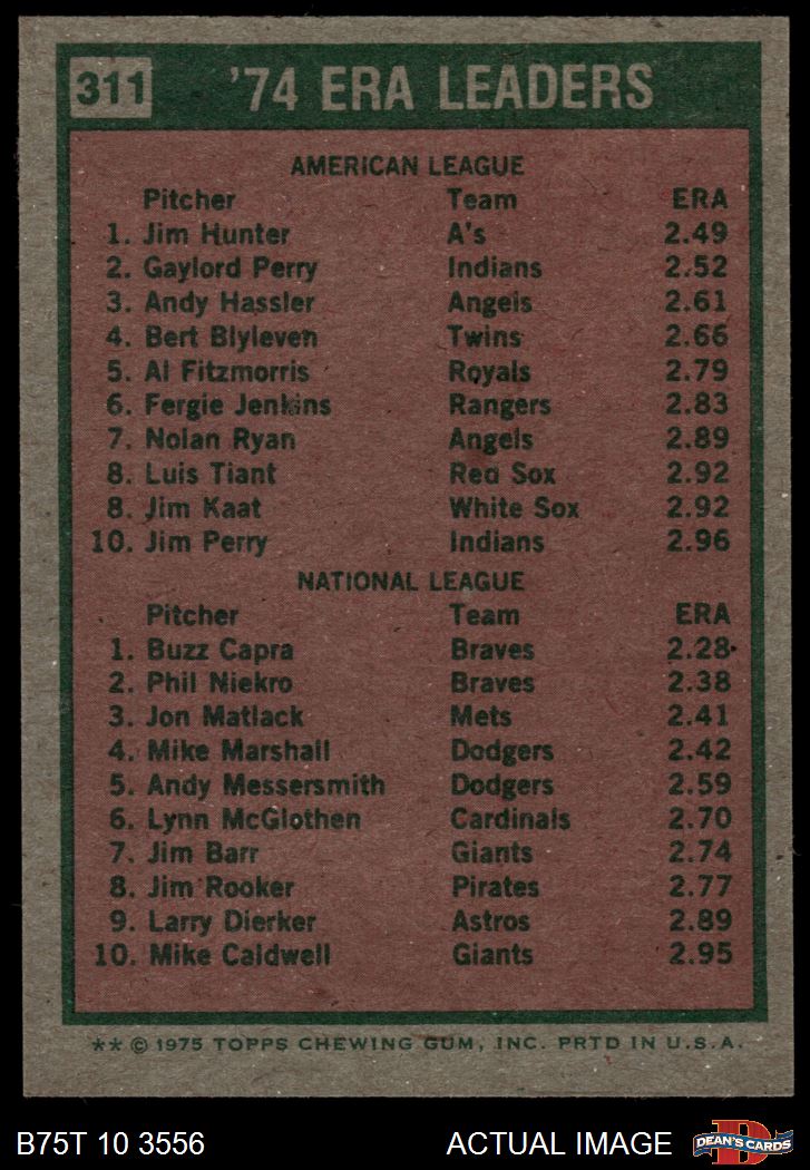 1975 Topps #311 - Catfish Hunter / Buzz Capra ERA Leaders 7.5 - NM+