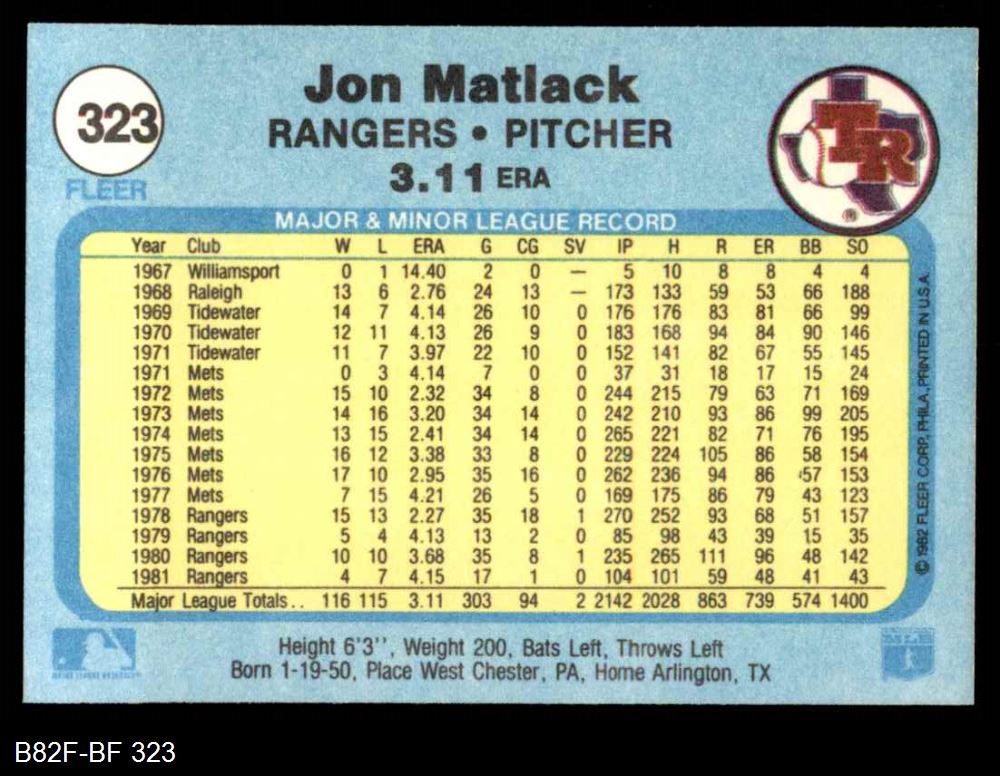 1982 Fleer #323 Jon Matlack 8 - NM/MT