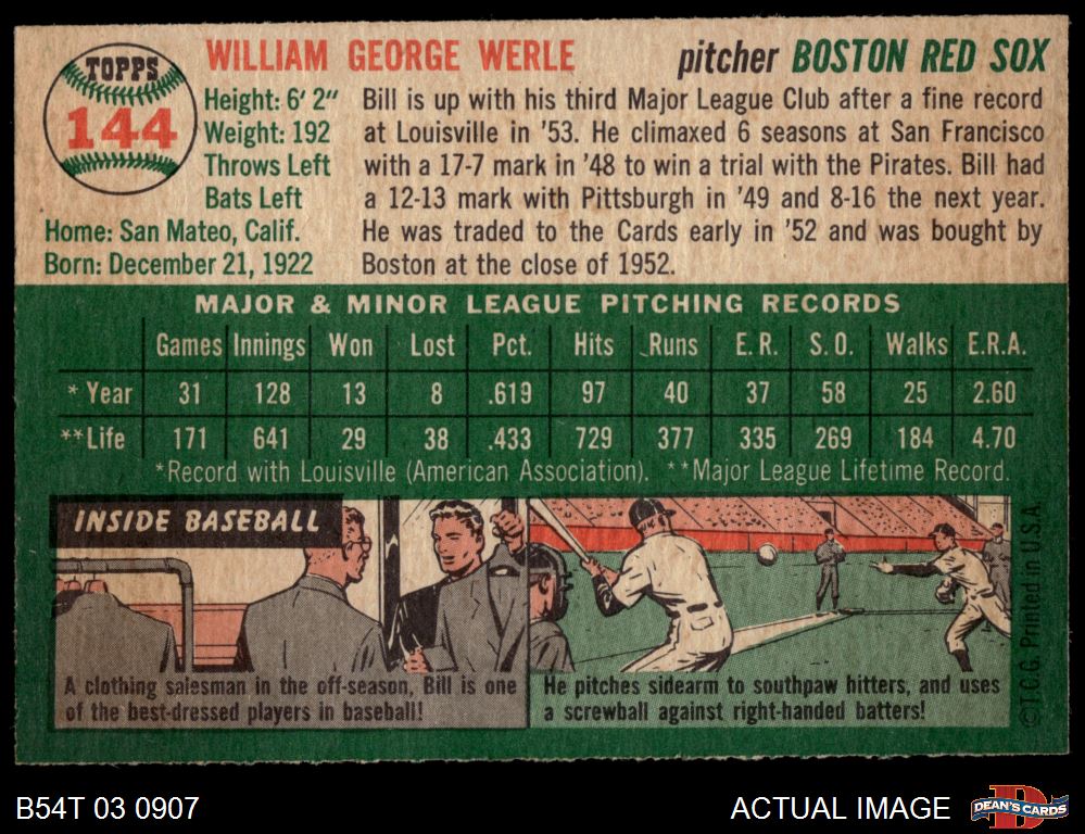 1954 Topps #144 Bill Werle 4 - VG/EX