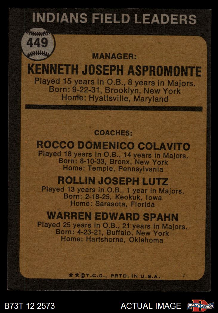 1973 Topps #449 PNT - Ken Aspromonte / Rocky Colavito / Joe Lutz / Warren Spahn Indians Leaders 3 - VG