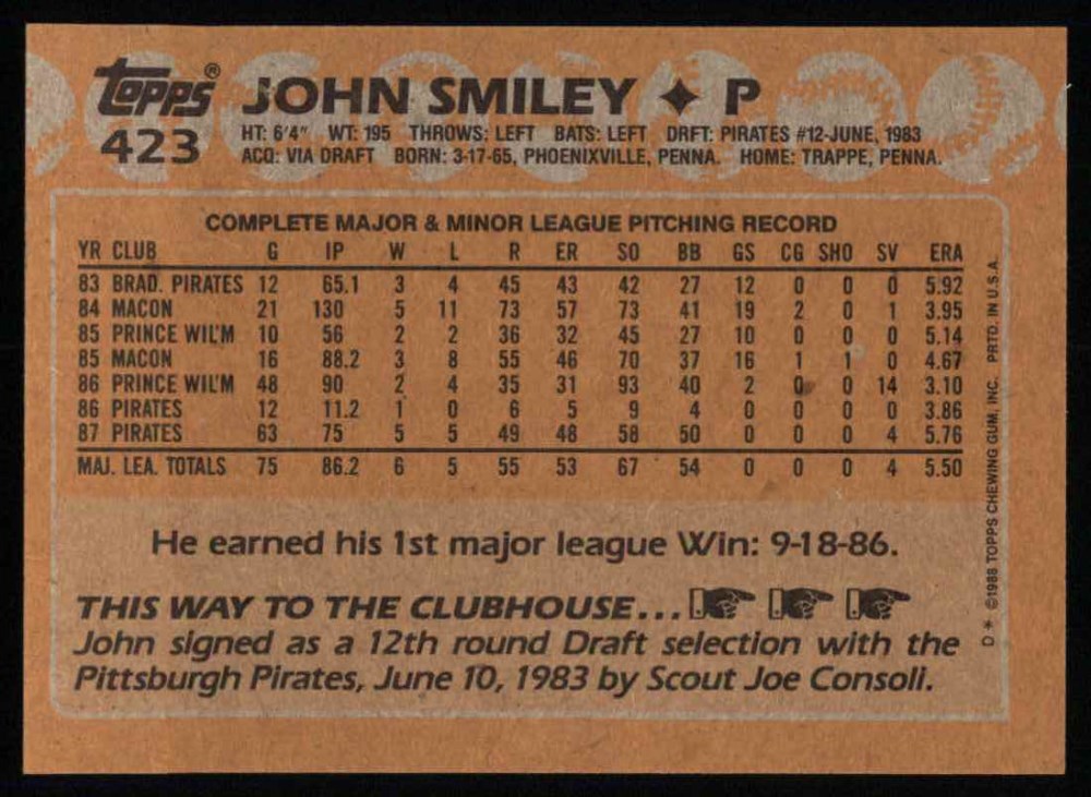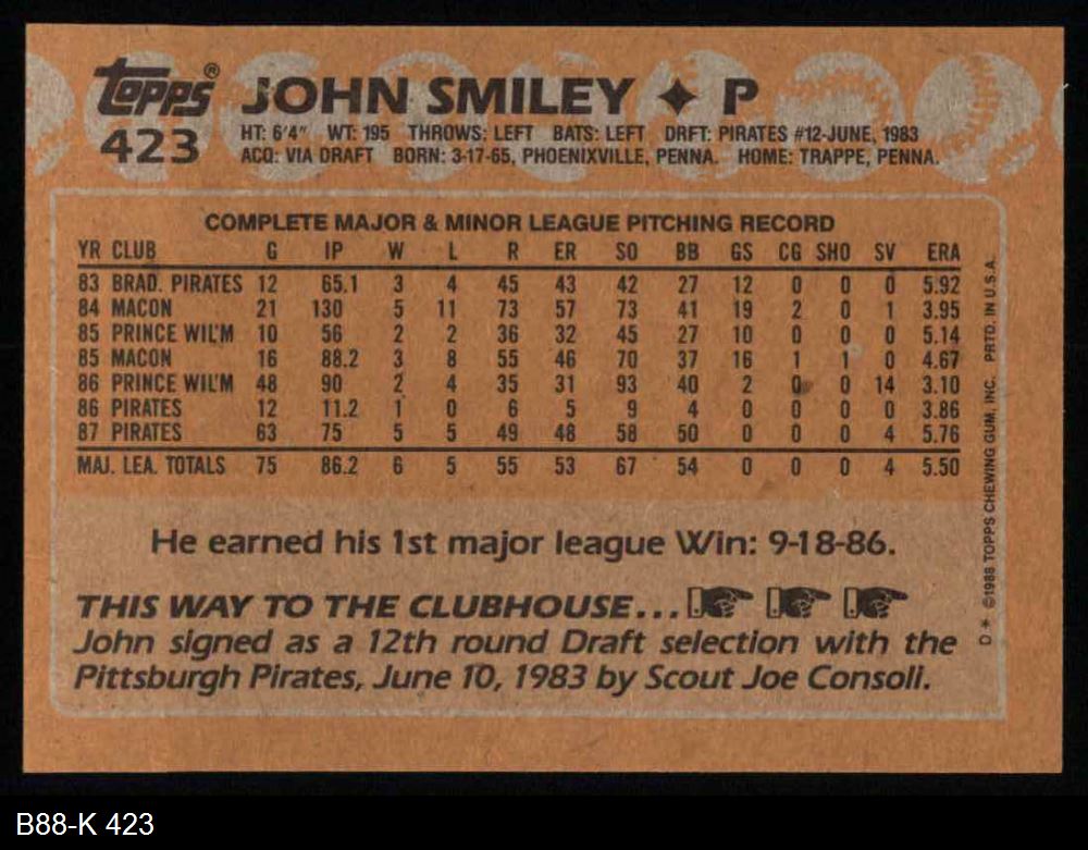 1988 Topps #423 John Smiley 8 - NM/MT